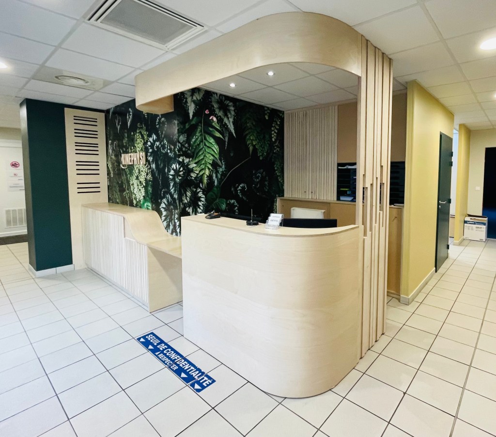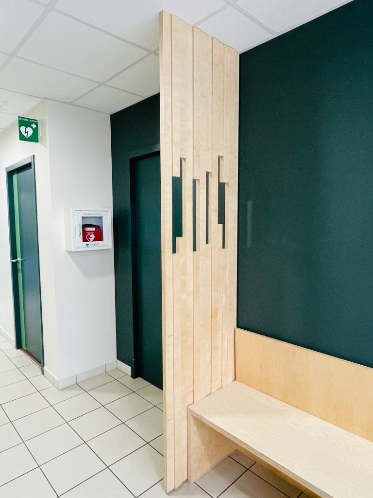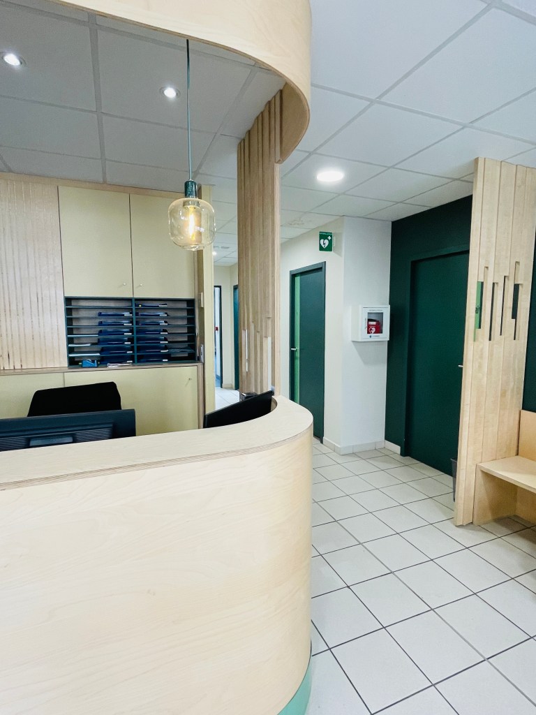 Dans la salle d’attente, le cabinet recevant de nombreux patients en surpoids, nous avons fait le choix de banquettes larges, robustes et confortables, en bois. L’absence d’assise délimitée a permis de rassurer les patients, en offrant un accueil inclusif, respectueux et chaleureux.