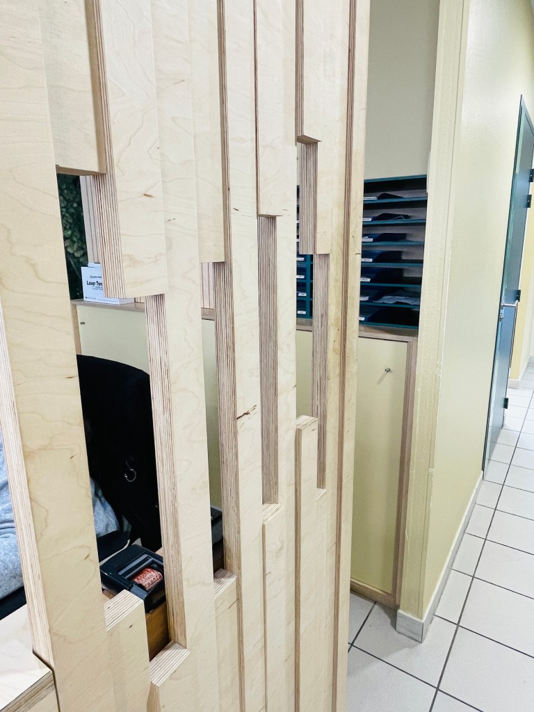 Une retombée de plafond vient envelopper l’espace de travail pour créer un véritable cocon, protégeant la secrétaire tout en clarifiant l’organisation spatiale. Les clients souhaitaient que les patients restent en face du poste d’accueil, évitant les contournements sur les côtés. Pour matérialiser cette séparation entre zone d’accueil et espace de soin, des claustras en bouleau ont été fabriqués sur mesure. Jouant sur les pleins et les vides ainsi que sur la profondeur, ils assurent à la fois discrétion et fluidité.